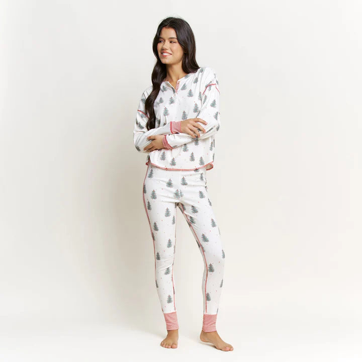A long sleeve henley crewneck paired with high rise joggers in a stretchy, ribbed jersey fabric.