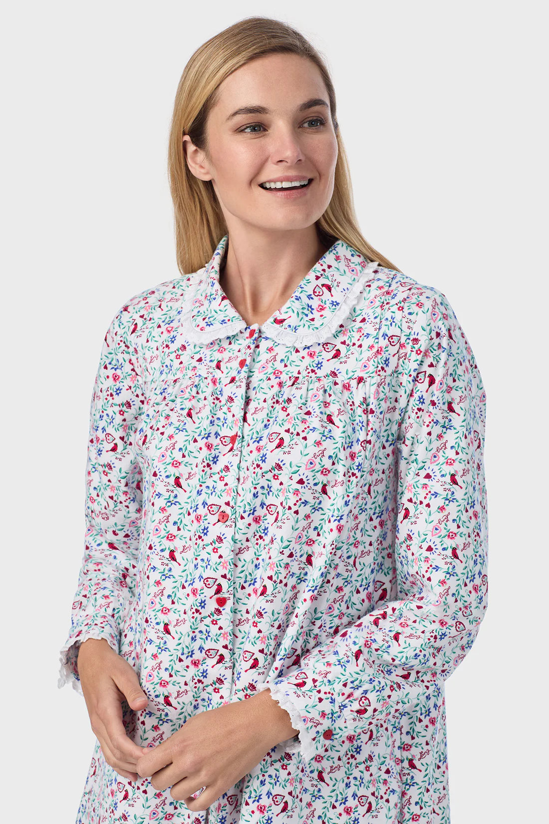 This Heart and Cardinal print is iconic Lanz. Sweet flowers and heart touches will warm your heart. Peter Pan collar and eyelet laces and red heart buttons make this truly special. Features side seam pockets